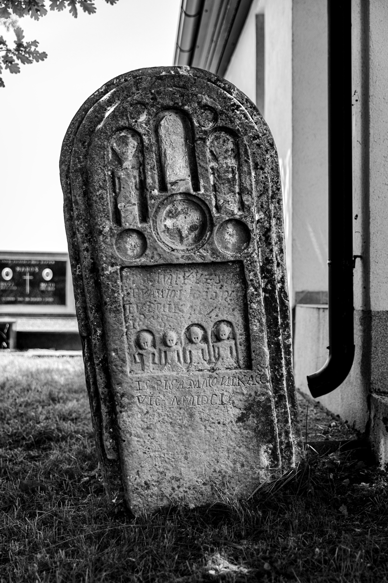 Nadgrobnik je uistinu poseban. Visok je približno 150 cm, najveća širina mu je 75 cm, debljina 40 cm. Prednja strana je bogato i neobično reljefirana. Pod zaobljenim vrhom tri su vertikalno postavljene niše, u dvjema krajnjim su isklesane stilizirane ljudske figure s glavama pod kapama što podsjećaju na biskupske mitre. Figura u sredini ostrugana je i neprepoznatljiva. Ispod figura su tri okrugle udubine - dvije manje i veća u sredini. I u njima su bili neki reljefni znakovi, ali su i oni ostrugani. U sredini je udubljeno polje s natpisom i četirima stiliziranim ljudskim figurama u reljefu. Natpis je nečitak - namjerno istrven ili izlizan vremenom? Raspoznaje se tek poneko slovo, i godina koja bi mogla biti 1858. Ispod ovoga polja teče tekst koji je potpuno čitak. Latinicom, u još nestabiliziranoj grafiji i pravopisu, tu stoji: