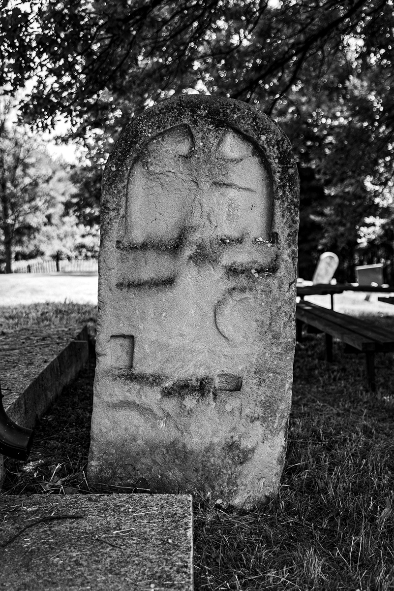 Nadgrobnik je uistinu poseban. Visok je približno 150 cm, najveća širina mu je 75 cm, debljina 40 cm. Prednja strana je bogato i neobično reljefirana. Pod zaobljenim vrhom tri su vertikalno postavljene niše, u dvjema krajnjim su isklesane stilizirane ljudske figure s glavama pod kapama što podsjećaju na biskupske mitre. Figura u sredini ostrugana je i neprepoznatljiva. Ispod figura su tri okrugle udubine - dvije manje i veća u sredini. I u njima su bili neki reljefni znakovi, ali su i oni ostrugani. U sredini je udubljeno polje s natpisom i četirima stiliziranim ljudskim figurama u reljefu. Natpis je nečitak - namjerno istrven ili izlizan vremenom? Raspoznaje se tek poneko slovo, i godina koja bi mogla biti 1858. Ispod ovoga polja teče tekst koji je potpuno čitak. Latinicom, u još nestabiliziranoj grafiji i pravopisu, tu stoji: